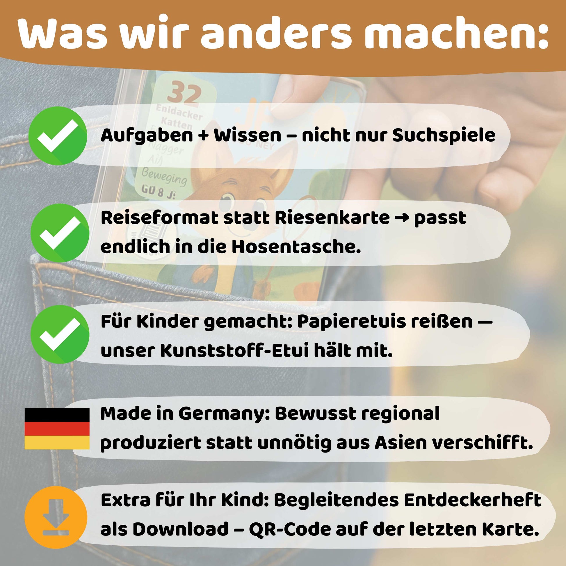 - Mit Zusatzwissen auf jeder Karte – pädagogisch wertvoll: Jede Aufgabe enthält eine spannende Zusatzinfo oder Forscherfrage. Spielerisch lernen & die Welt verstehen – alleine oder gemeinsam mit Freunden oder Eltern.